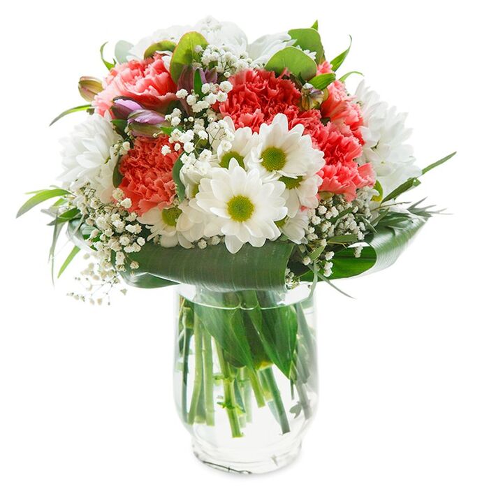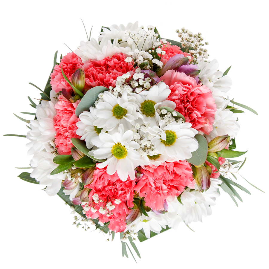 Show your appreciation with our refined white and pink flower arrangement. This bouquet features a blend of snow-white chrysanthemums, gypsophila, and light pink carnations, elegantly arranged with aspidistra leaves.